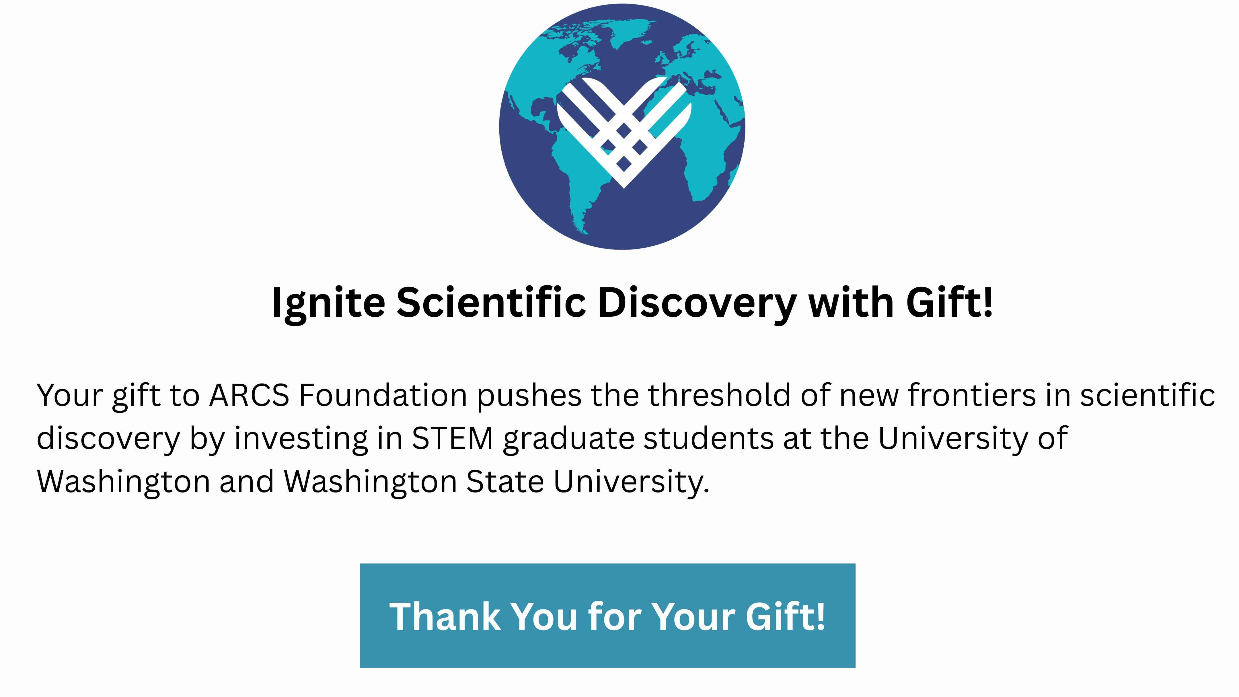 ARCS Seattle Chapter awards $22,500 over three years in unrestricted support to each ARCS Scholar, supporting their scientific education and research. Funds raised today will support future ARCS Scholar Awards and programs at the UW and WSU. To learn more about supporting ARCS through Named ARCS Scholar Awards, Endowed ARCS Scholar Awards, Planned & Estate gifts, and other types of giving, you may contact Jennifer Gill at jenng@seattlearcsfoundation.org. See below for details on how to give today to support ARCS Foundation!
